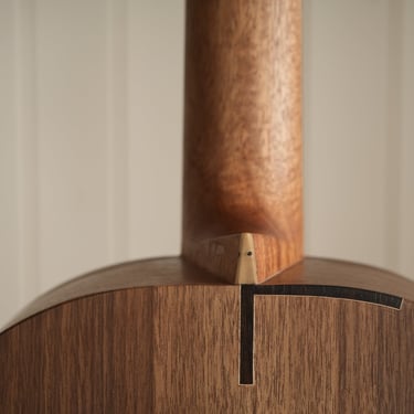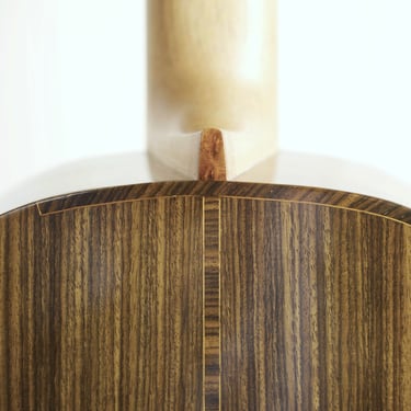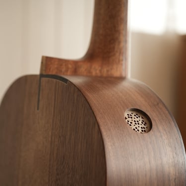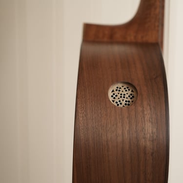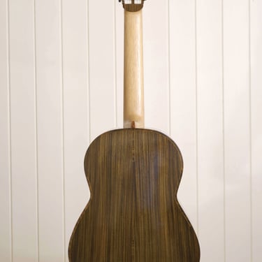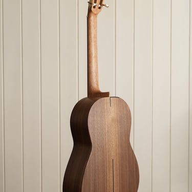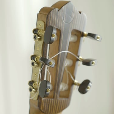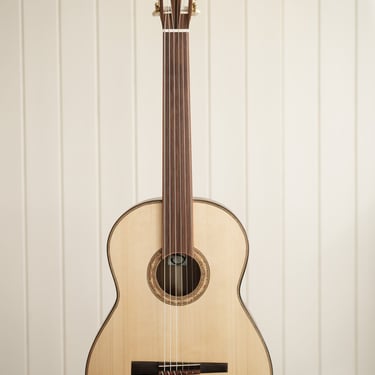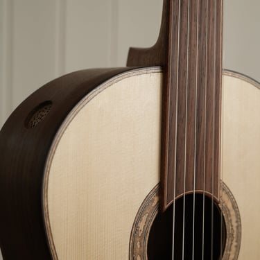 Fretless classical guitar for bariton or normal strings. Neck is a little thinner than normal classical dimensions. Oil finish gives a smooth touch and natural feeling - as well as good protection against scratch marks. This fretless classical guitar has a rich voice with a muted attac remnicent of oud. Very light flamenco-like guitar, that can be fitted with gut frets if wanted. Soundport covered with parchment detail.