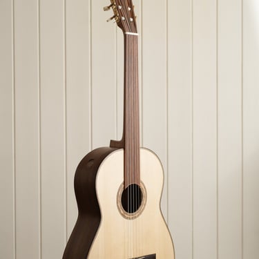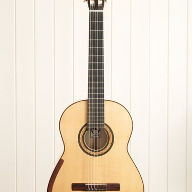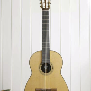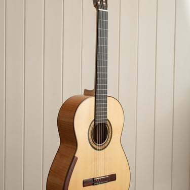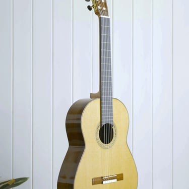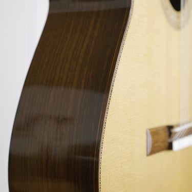 Concert model classical guitar with cedar top and indian rosewood back and sides. Balance, warmth and evenness characterizes the voice of this guitar. Traditional woods and french polish and relatively light weight.