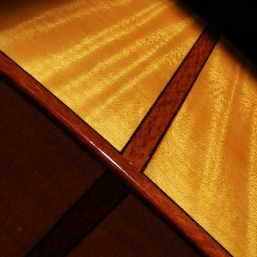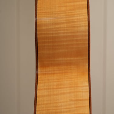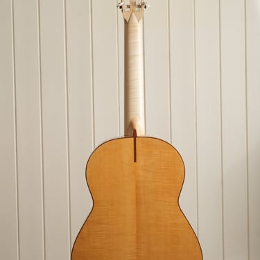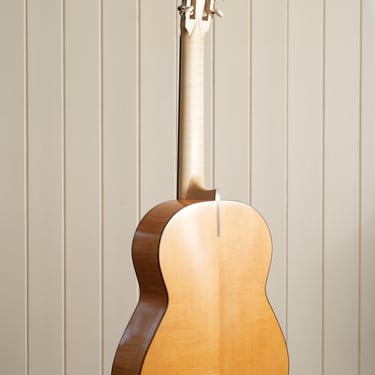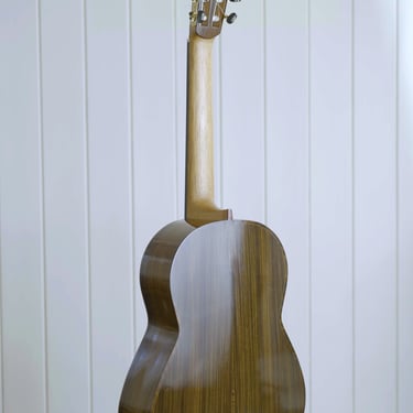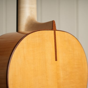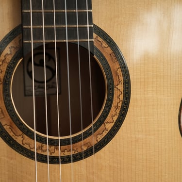 This light wonderful classical guitar reponds great through all registers with rich trebles and open basses. The neck is built with a very stiff spruce core covered with flamed maple, v-joint head union and spanish heel construction contributing to a very light guitar that vibrates beautifully on your lap. The guitar is french polished with button schellac slighty coloured with padouk giving it a golden colour. The cocobolo armrest adds comfortability playing both ponticello and tasto. Bindings are reddish brazilian lacewood that contrasts and accentuate the flamed maple sides. Rosette combinates traditional marquetry in blue, black and yellow with the spalted ash forming an irregular circle. Contact for sound sample.